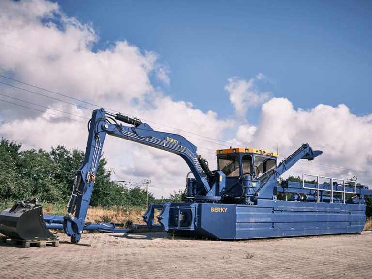 Berky liefert die passende maschinelle Lösung für ihr Gewässerproblem auch mit amphibischen Booten.