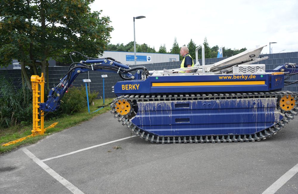 Für die Teichreinigungsarbeiten wurde der BERKY NEREUS 240 AMPHI mit dem BERKY Schneidwerk und der BERKY Sammelharke ausgestattet. Mithilfe des Schneidwerks konnten Schilfpflanzen effizient geschnitten und somit die Überwucherung des Teichs verhindert werden. Anschließend kam die Sammelharke zum Einsatz, um schwimmende Pflanzenreste und andere Verunreinigungen, die sich im Wasser angesammelt hatten, aufzunehmen.
